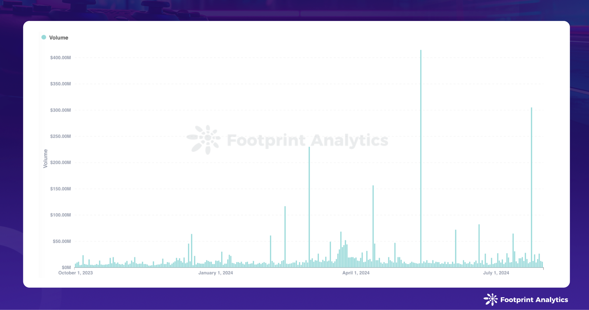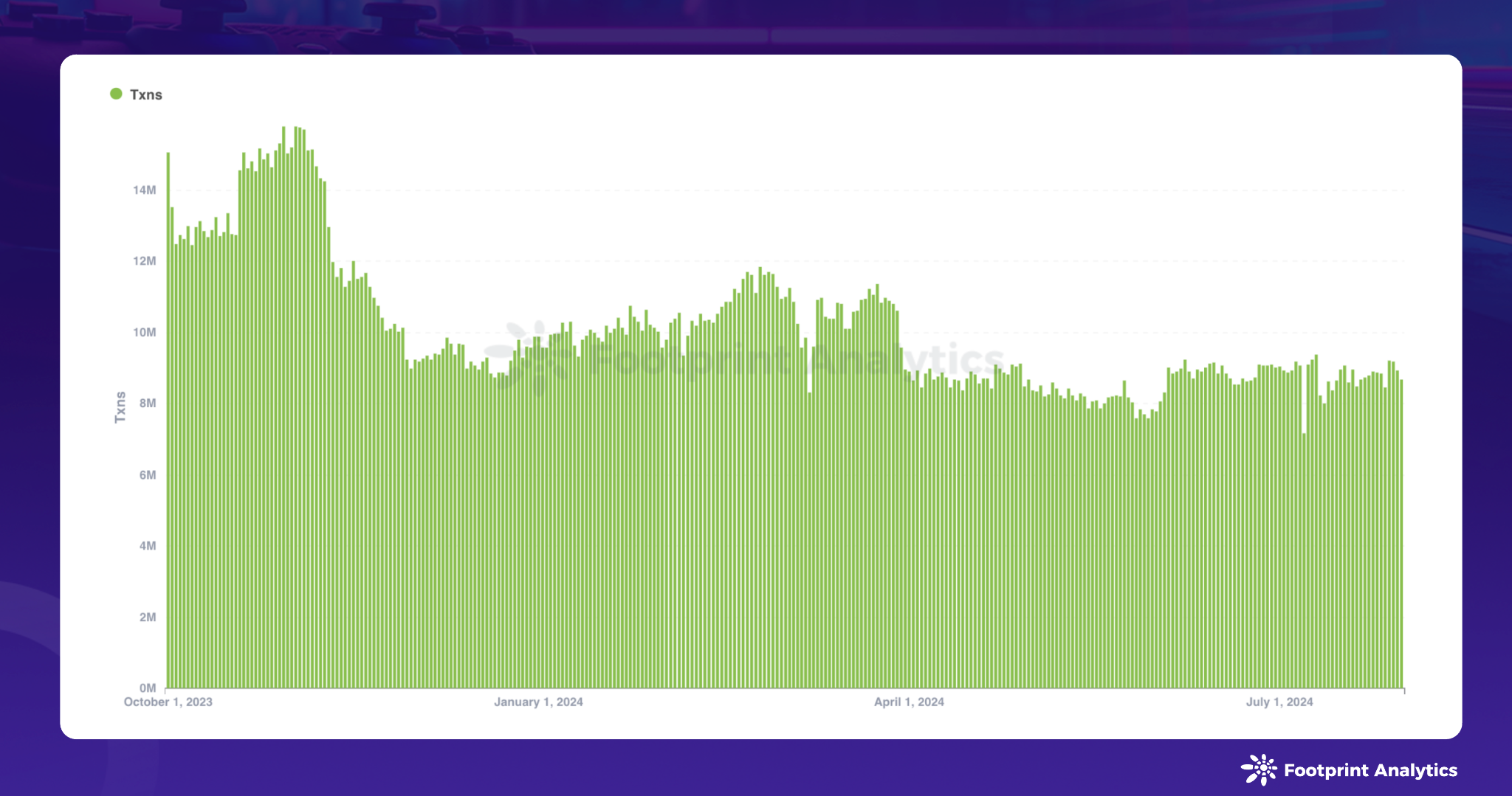 然而,7 月的数据呈现出混合态势。尽管 DAU 显著增长,但区块链游戏的日均交易笔数为 880 万,较 6 月份微幅下降 0.4%,延续了自去年 10 月以来的下降趋势。