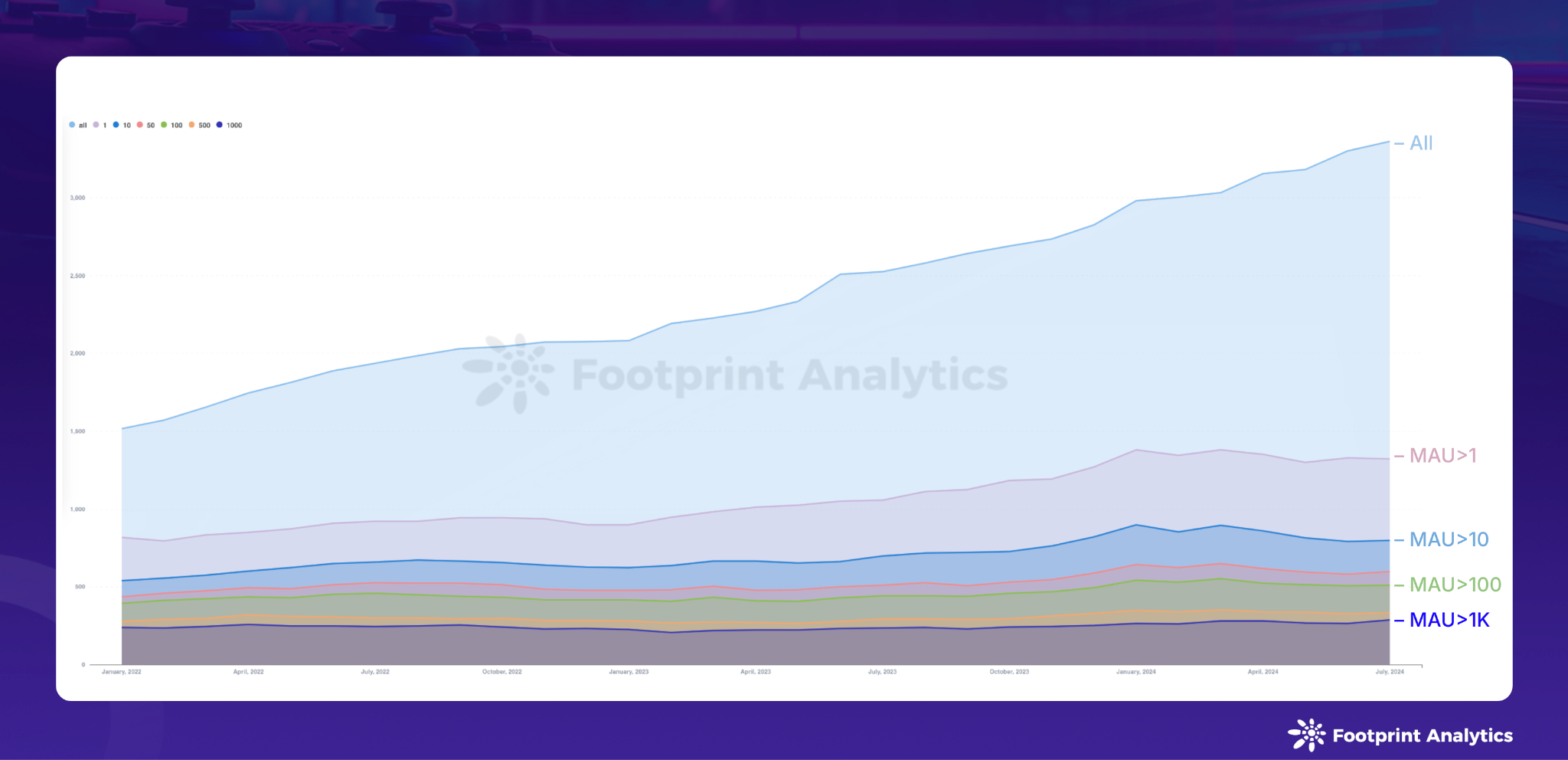 7 月份,区块链游戏领域共计有 3,362 款游戏,其中 1,322 款保持活跃。在这些游戏中,有 289 款吸引了超过 1,000 名每月活跃链上用户(MAU),占所有游戏的 8.6%,占活跃游戏的 21.9%。