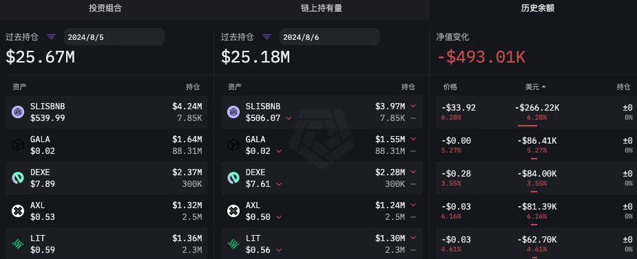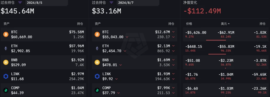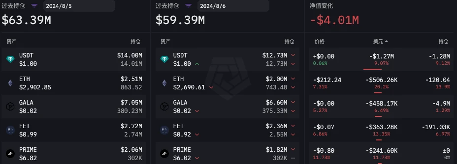 在“85”暴跌之前,根据ARKHAM数据,Flow Traders链上公开地址在8月1日至8月5日总持仓量净值在减少。主要变化为:ETH持仓减少633.93枚,BTC持仓减少142.69枚,稳定币持仓减少变化并被明显。详细数据如下图所示。
