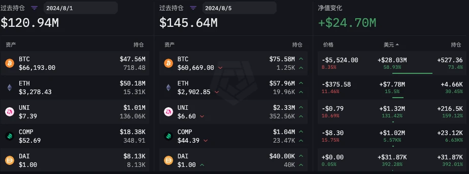 在“85”暴跌之前,根据ARKHAM数据,B2C2 Group链上公开地址在8月1日至8月5日总持仓量净值在增长。主要变化为:ETH持仓增长4650枚,BTC持仓增长531.52枚,同时还增持了21.65万枚UNI、2.3万枚COMP、3.2万枚DAI。详细数据如下图所示。