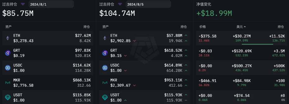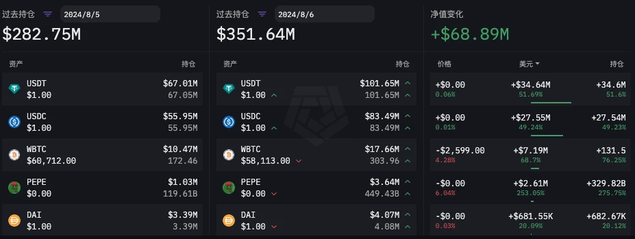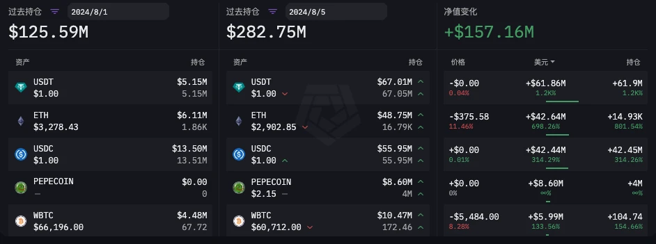 在“85”暴跌之前,根据ARKHAM数据,Wintermute链上公开地址在8月1日至8月5日总持仓量净值在增长。主要变化为:稳定币USDT和USDC持仓增长超1.04亿枚,ETH持仓增长超1.493万枚,WBTC持仓增长104.74枚,同时还增持了400万枚PEPE。详细数据如下图所示。