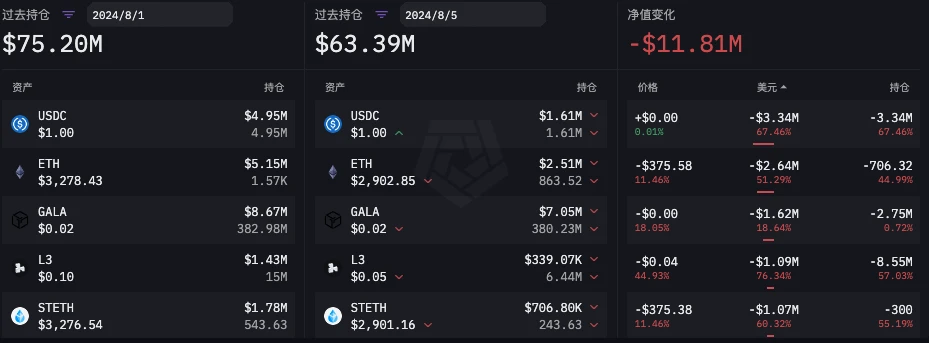 在“85”暴跌之前,根据ARKHAM数据,GSR Markets链上公开地址在8月1日至8月5日总持仓量净值减少。主要变化为:ETH持仓减少超706枚,STETH持仓减少300枚,稳定币USDC持仓减少超334万枚,L3 持仓减少超856万枚。详细数据如下图所示。