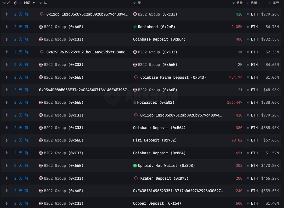 B2C2 Group ETH链上公开地址持仓量变化(来源:ARKHAM)