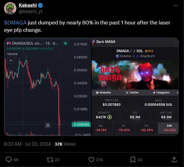埃隆·马斯克暂时将 Twitter 头像改为激光眼 。虽然这是一个强有力的催化剂,但当他再次更改头像时,价格迅速下跌。事情变化得非常快,通常如果你没有提前获利,就无法在最佳时机进行对冲。