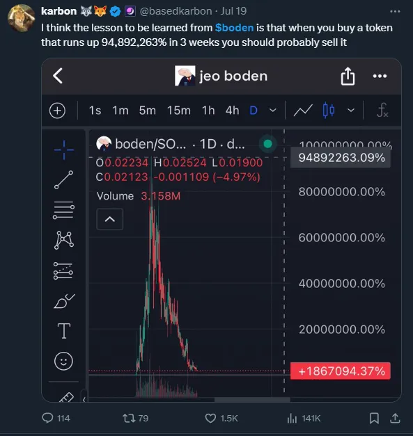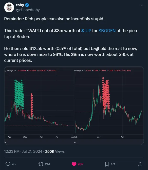 巨鲸在顶峰以 800 万美元出售 $JUP 兑换 $BODEN,损失 98% ,将其 800 万美元变为 8.5 万美元。