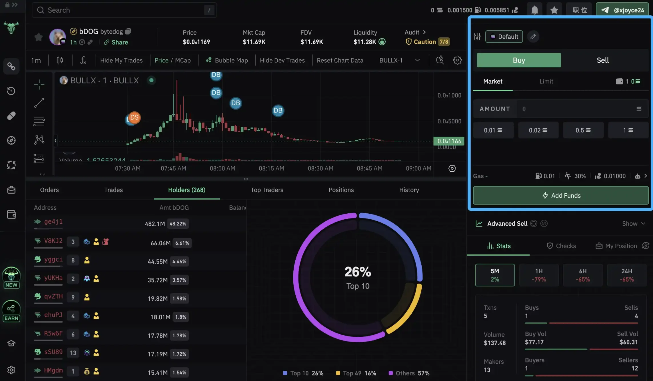 GMGN 在交易操作按钮附近显示了即时盈利情况,可以辅助使用者根据盈利情况决定卖出的需求。而另一个工具能够提供多钱包同步操作、设定范围内随机金额交易等功能,适合有更多订製化交易需求的使用者。Bullx 则可以让使用者进行交易挂单,但考虑到 meme 交易对的流动性普遍不够深,对一些 meme 玩家来说,挂单功能的实际用处不大。