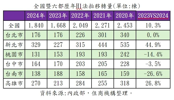 住 商机构观察内政部统计数据指出,2024 年上半年,全台法拍房移转栋数达 1,840 栋,较去年同期增加约 10%。其中,六都中以新北市的法拍移转量最高,达到 329 栋,年增幅达 44.9%。其次是高雄市,共计 270 栋,年增 26.8%。