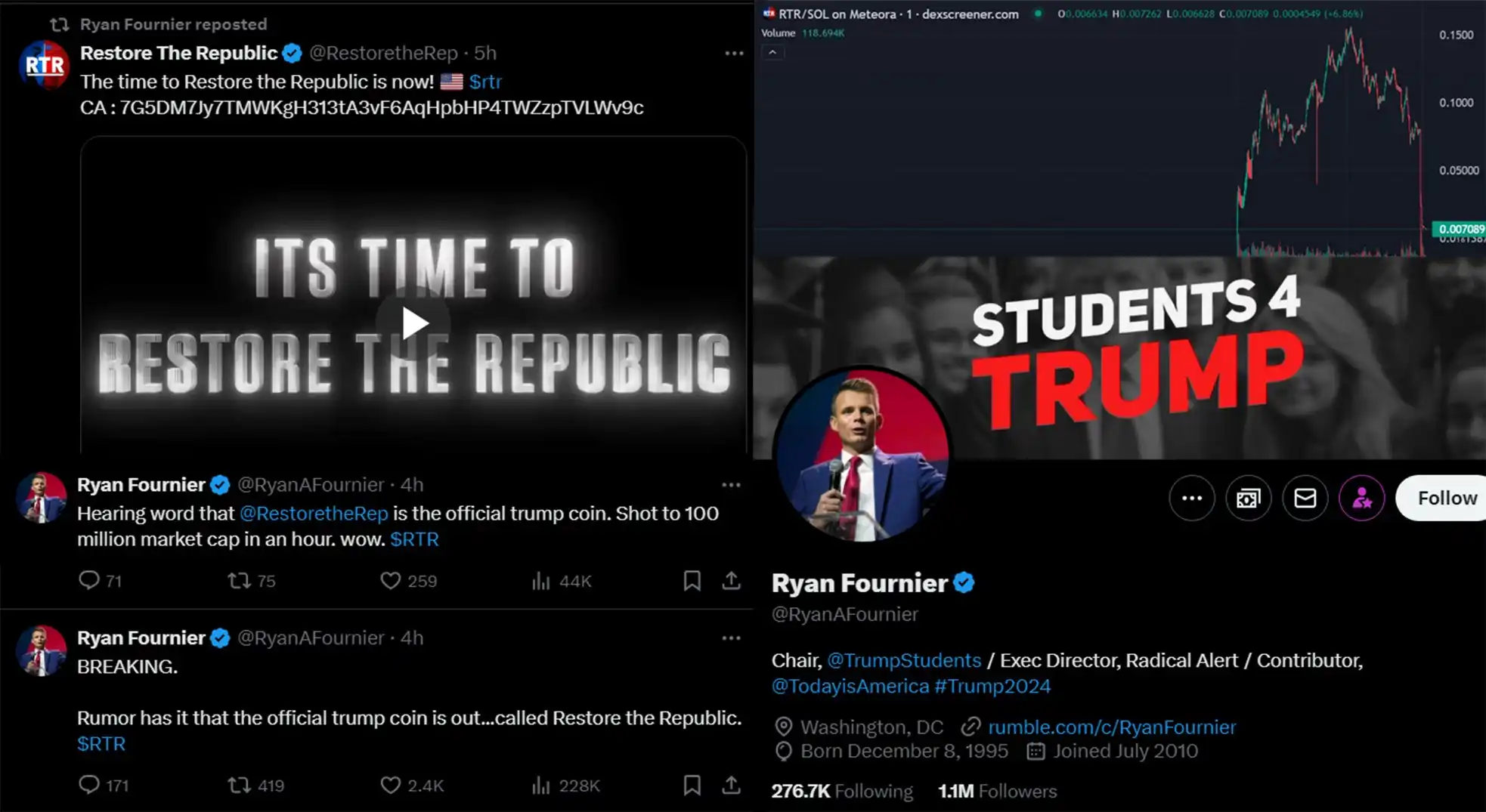RTR 的故事始于特朗普粉丝组织「TrumpStudents」的主席 Ryan Fournier,现在他已经删除了所有关于代币的宣传推文。根据社区流传的截图显示,Ryan Fournier 在昨晚放出了代币$RTR「Restore the Republic」的合约地址,并表示「有传言称,官方的特朗普代币已经面世……名为「Restore the Republic」」。