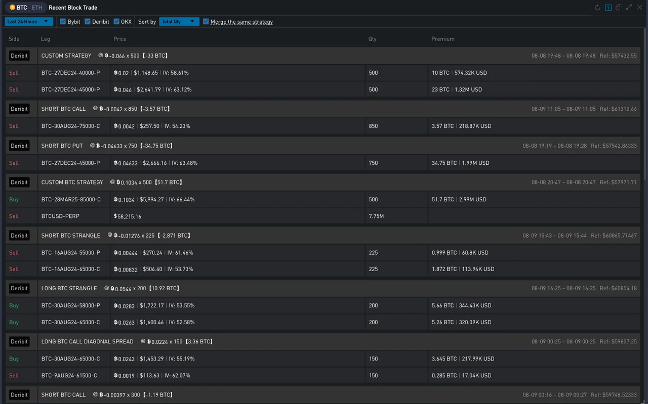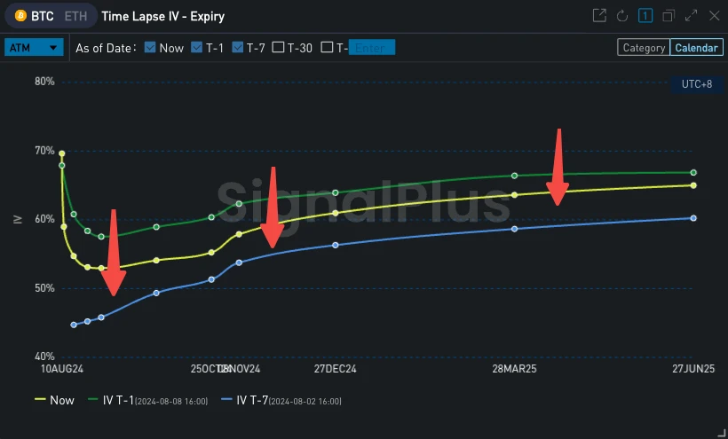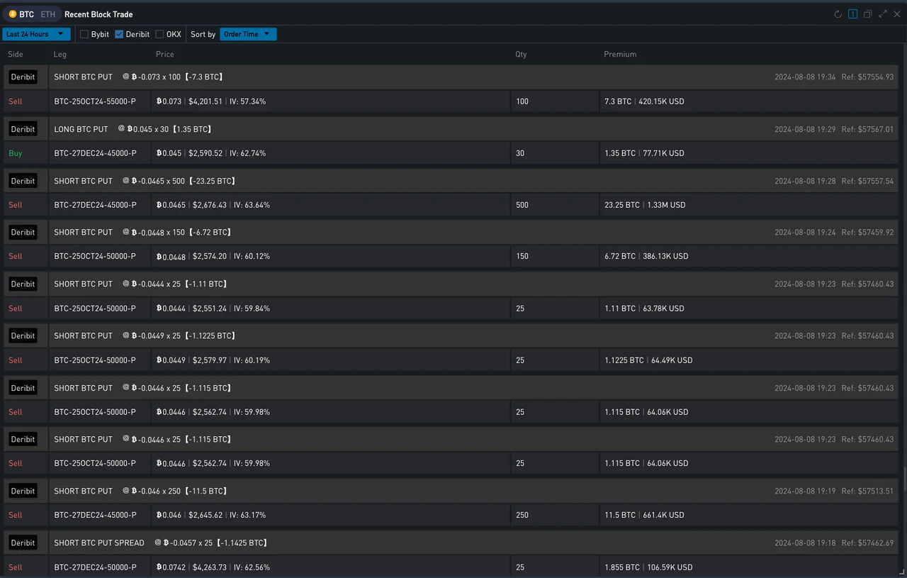 事情开始于 8 月 8 日晚上 7: 30 左右。在此之前,昨日 BTC 的画门行情将市场整体隐含波动率逐步推至高点,而正当价格恢复平静在 57500 附近小幅整盘时,Deribit 市场上突然出现大量 Dec 和 Oct 的卖出看跌期权成交,年底的 IV 短时间内被砸低 3% Vol,带动整条 Vol Curve 大幅向下平移。