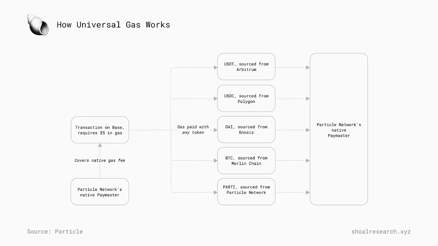 通用 Gas 是 Particle 链抽象堆栈的第三大支柱,是实现 Gas 抽象的关键,允许终端用户在任何链上用任何代币支付 Gas 费用。比如,Alice 可以使用她在 Base 上的 USDC 支付 Solana 上的交易 Gas 费用,而 Bob 则可以使用他在 Optimism 上的 OP 代币支付购买以太坊上 NFT 的 Gas 费用。