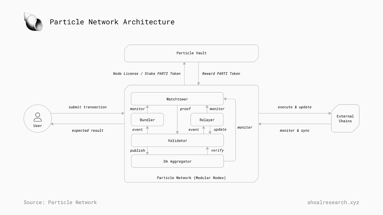模块化节点的使用允许任何人参与运行专门用于促进 L1 关键操作的节点。这些节点可根据各自的功能进行分类,比如捆绑节点负责执行跨链用户操作;中继节点负责监控交易状态(如已执行、失败)并将其传回 Particle L1 进行结算;监控节点(watchtower nodes)负责监控捆绑节点和中继节点网络中的节点及其各自任务的状态,并为每个区块每个 epoch 提供执行和欺诈证明。