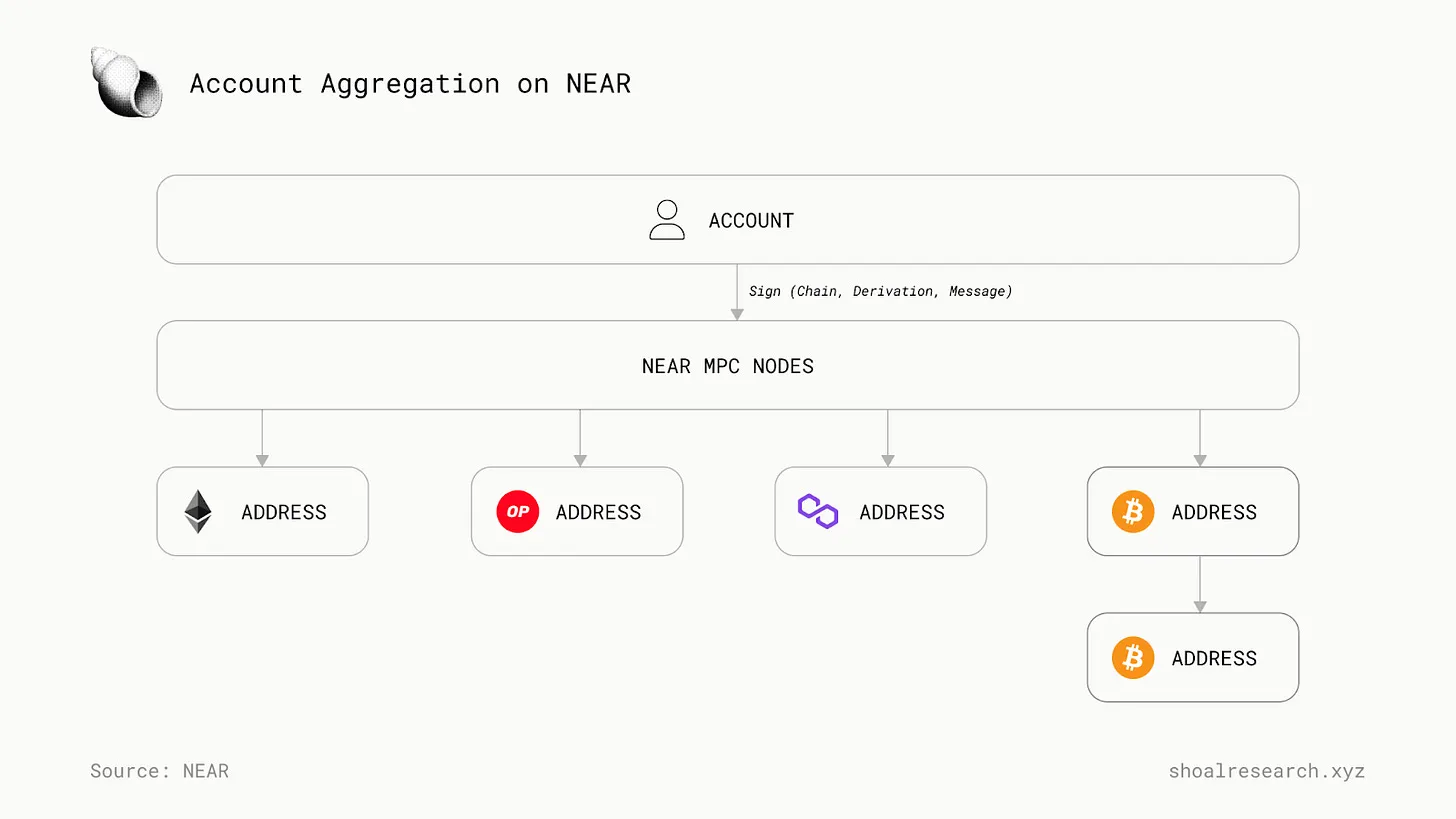 Near 是一个分片式 PoS L1,正在通过账户聚合(Account Aggregation,一种多层面结构,可将用户的跨链交互通过单一账户运行)构建其链抽象堆栈。