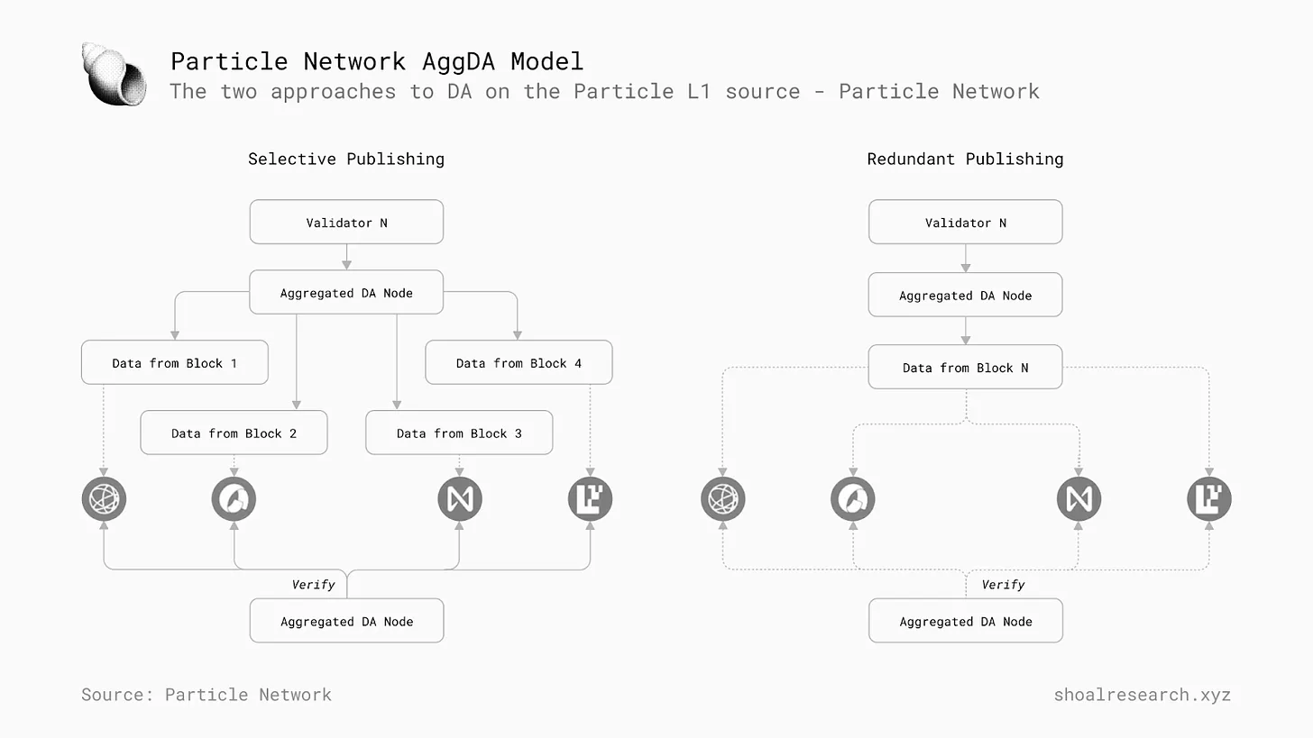 在区块链中,数据可用性(DA)是指验证已发布到区块链中的数据的能力。通常情况下,区块链会采用单一的数据可用性解决方案,这种解决方案可以是集成架构下的内部解决方案,也可以是模块化架构下外包给合作伙伴或第三方提供商的解决方案。Particle 正在构建其 DA 模型,通过采用聚合模型,将 DA 集体外包给 Celestia、Avail 和 Near DA,以减少整个架构中的单点故障。Particle 采用了两种不同的 DA 方法,包括选择性发布(将每个区块分配给单独的 DA 提供商)和冗余发布(将每个区块发送给每个 DA 提供商)。