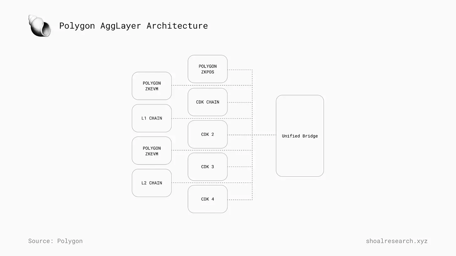 Polygon 正在开发 AggLayer,这是一个使用 Polygon CDK 为 L2 构建的统一跨链桥,可以聚合 zk 证明并统一提交给以太坊进行结算。在这种模式下,所有链都与其他受支持的 AggLayer 链共享一个跨链合约,可在保持独立性的情况下获得更多流动性,使早期网络的启动更加容易。