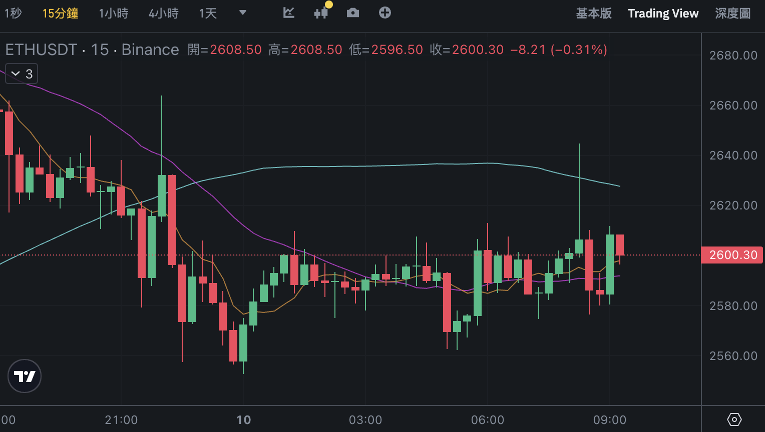 以太币走势与比特币类似,虽然一度在今日上午 8 点 15 分攀升至 2,644 美元,但整体趋势仍在 2,600 美元水平盘整。截稿前报 2600.3 美元,近 24 小时下跌 2.26%。