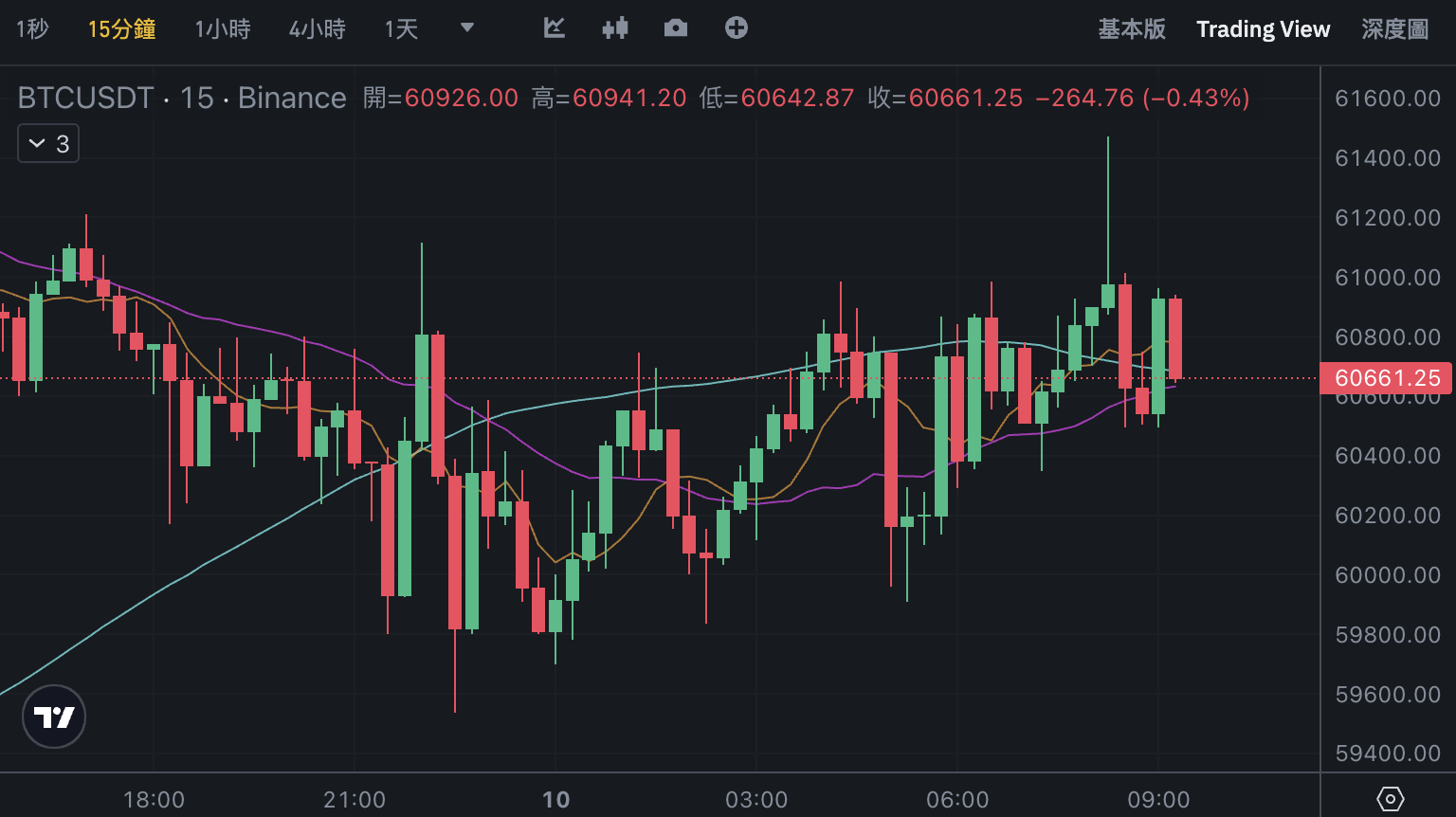 比 特币在昨(9)日清晨一度上攻 62,745 美元后,便𫔭始震盪下行,在昨晚 10 点半一度回落至 59,535 美元,目前持续在 6 万美元附近震盪。截稿前比特币现报 60,661 美元,近 24 小时下跌 1.01%。