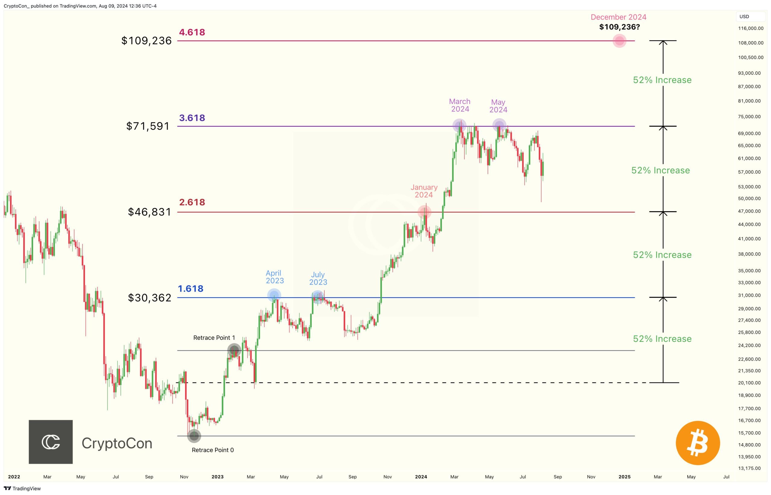 接下来的 52% 涨幅和 0.618 延伸将推动价格突破 100,000 美元大关,达到 109,236 美元。