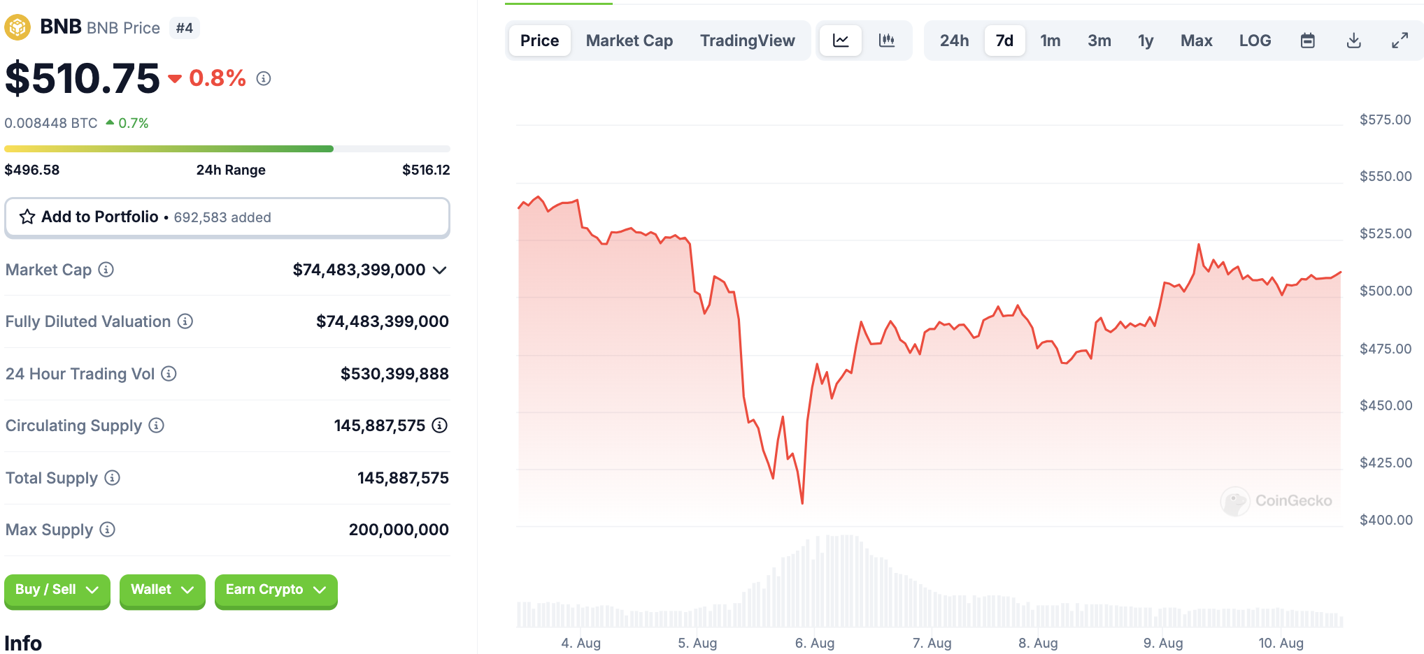 据 CoinGecko 数据 显示,BNB 现报 510.75 美元,近 24 小时小跌 0.8%,与 5 日约 410 美元的最低点相比,已回升 24.5%。