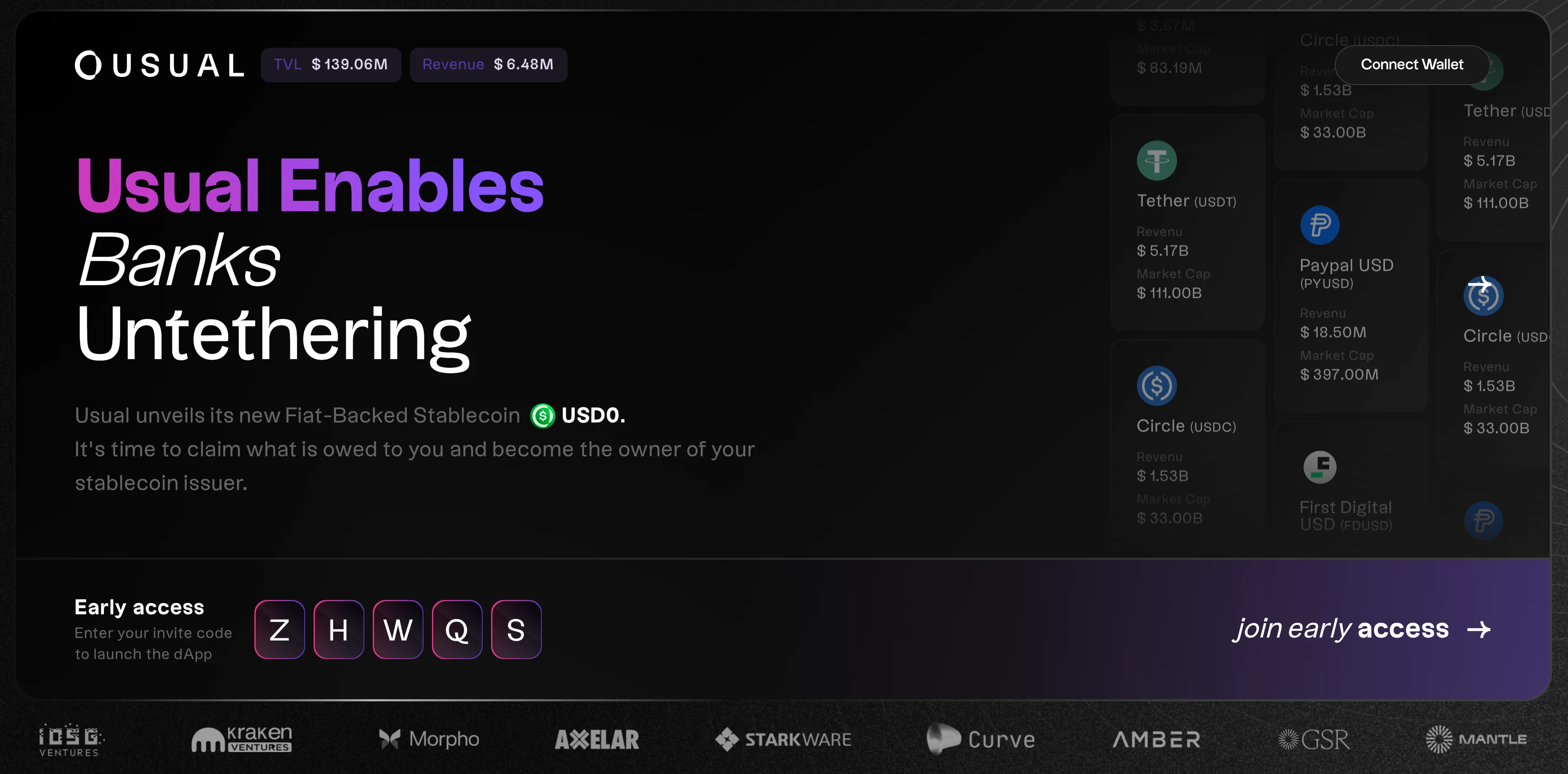1. 打开 Usual Money dApp:https://app.usual.money/#ZHWQS 或通过官网进入然后输入早期访问代码:ZHWQS