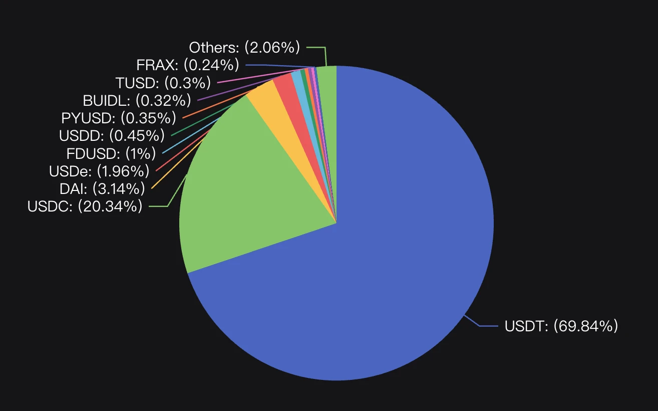 稳定币可以说是加密货币行业的根基,人们需要稳定币来作为大规模支付的用例,同时稳定币也在行业的 Mass Adoption 中发挥着关键作用。截至 2024 年 7 月 30 日,稳定币总市值为 $ 168 B,而从下面这张稳定币市值概览图中可以看出,两大中心化稳定币,USDT 和 USDC 加起来占据了稳定币总市值的约 90% 。