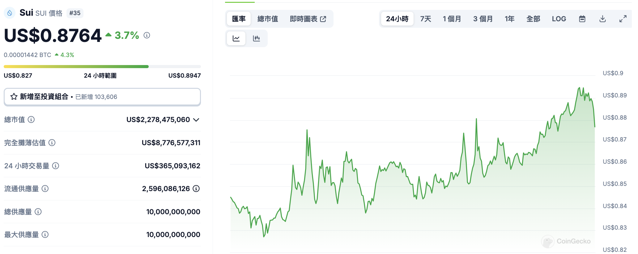 在市场整体相对稳定之际,Move 系公链 Sui($SUI)持续上涨,在今日一度飙升超过 8%,最高触及 0.89 美元。