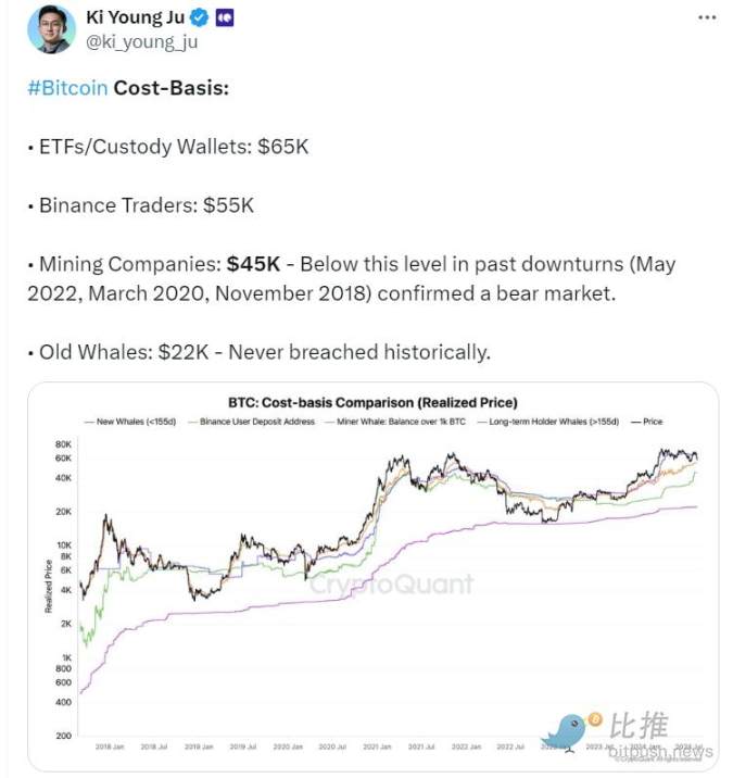 除了上面的直观资料,CryptoQuant 执行长 Ki Young Ju 提供了一个值得参考的资料统计分析。 8 月 6 日,CryptoQuant 执行长 Ki Young Ju 于 X 发文表示,资料显示比特币成本基础(Cost-Basis)如下:ETF/ 讬管钱包:6.5 万美元;币安交易员:5.5 万美元;矿企:4.5 万美元,在过去的市场低迷时期(2022 年 5 月、2020 年 3 月、2018 年 11 月),低于这一水平证实了熊市;老鲸鱼:2.2 万美元。如上文所言,比特币目前从大趋势上仍以牛市为主,而且从矿业机价角度来看,4.5 万美元几乎是比特币下跌极限值。