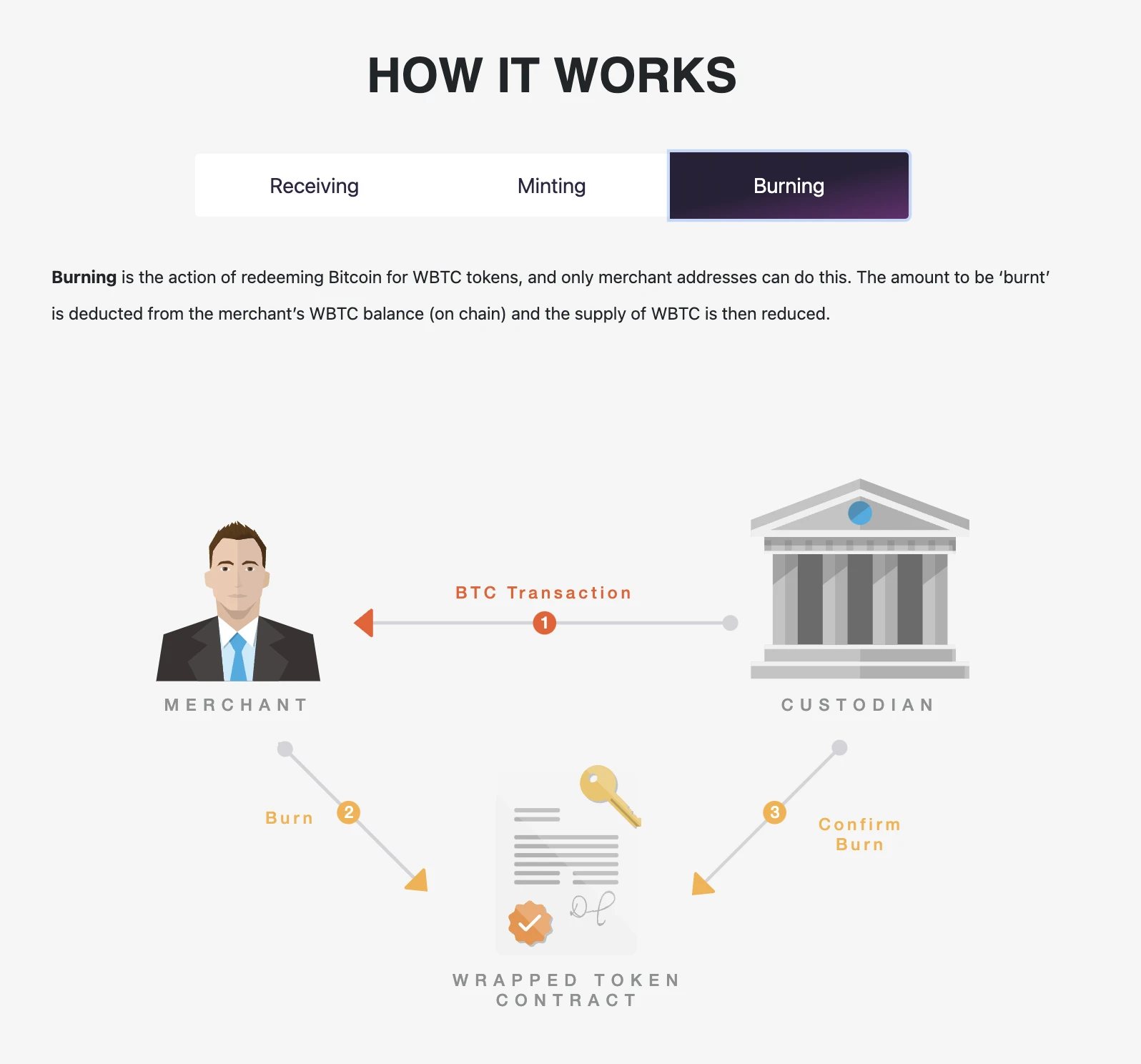 此外, WBTC 项目官网提到的 Burning 环节也对 WBTC 供应量减少的可能进行了说明,且“只有 Merchant 地址可以执行销毁操作”。