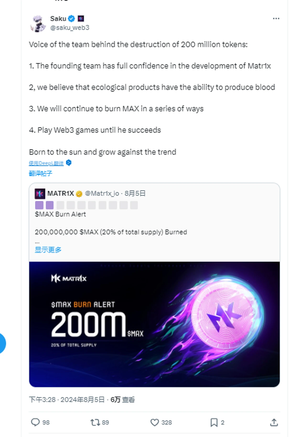 除了以 1.6 亿美金的极低 FDV 开盘外,MATR1X还进行了一个引人注目的操作——在 8 月 5 日交易开盘前 4 个小时,$MAX 燃烧了 2 亿枚代币。