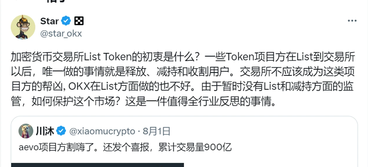 市场开始有这样的转变,或许也跟 OKX、币安这样的头部大所想要整顿行业的决心有极大关系,OKX 创始人曾在 8 月 2 日公开发贴,直指项目上所问题,指出一些 Token 项目方在 TGE 后,唯一做的就是释放和减持,交易所不应该成为高 FDV 低流通项目的帮凶,呼吁大家保护这个市场。
