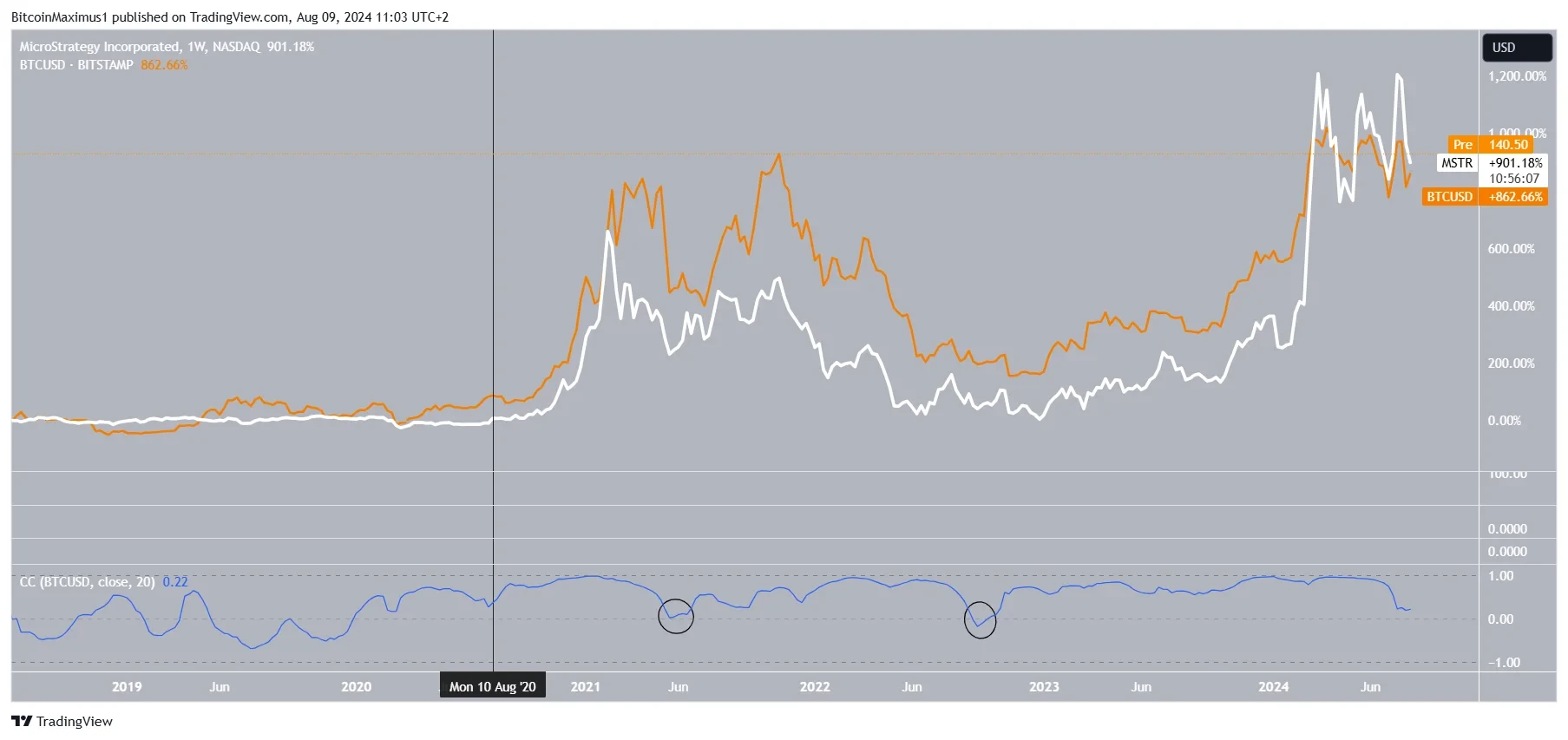 情况或正是如此。在 MicroStrategy 于 2020 年 8 月首次购买比特币之前(黑色标记),MSTR 和比特币价格之间几乎没有相关性。相关系数(蓝色标示)在零附近波动,显示两种资产之间没有实际关系。