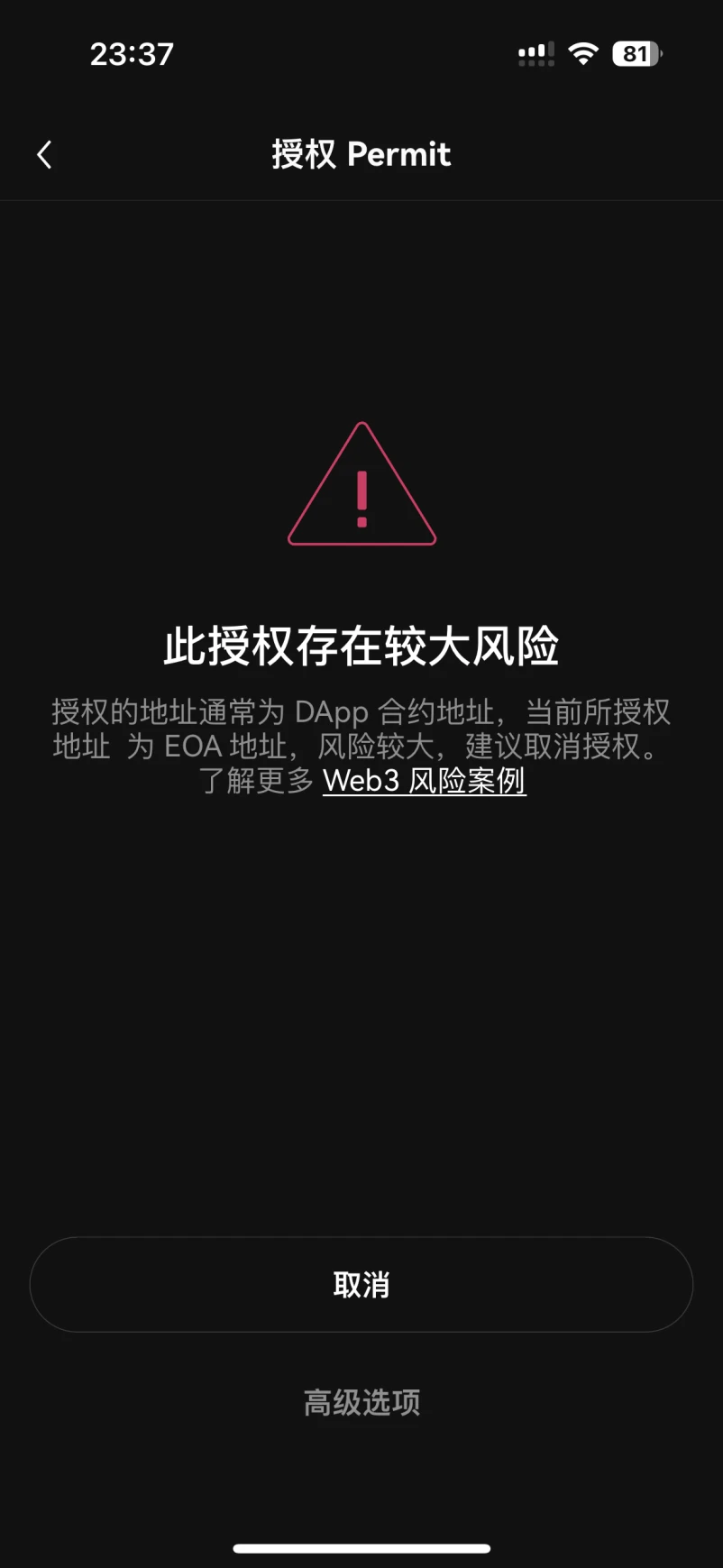 OKX Web3钱包会通过对待签交易进行前置解析,若解析发现交易为授权行为且授权的地址为 EOA 地址时,则为用户告警提醒,防止用户被钓鱼攻击,造成资产损失。