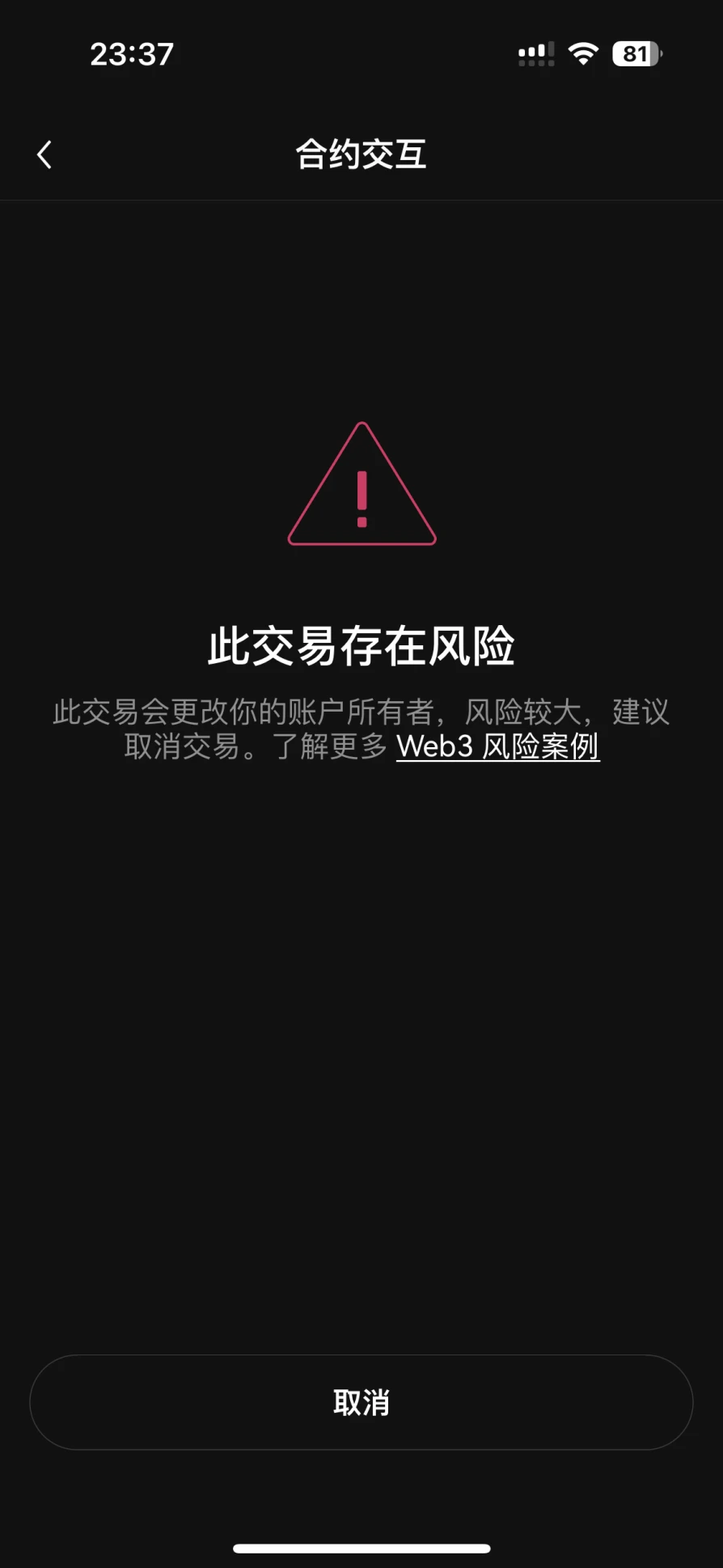 OKX Web3钱包通过对待签交易进行前置解析,若解析发现交易内存在更改账户权限行为,则会为用户直接拦截交易,从根源阻止用户进一步签名,造成资损。