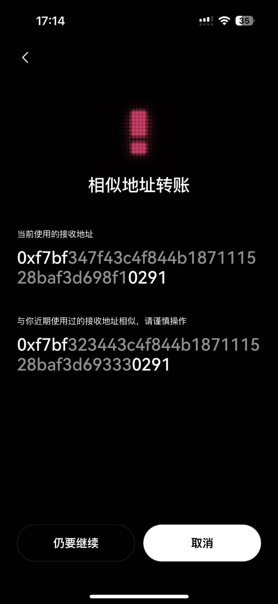 OKX Web3 钱包通过对链上的交易进行持续监控,如果发现在 1 笔大额交易发生后不久,链上立刻发生非用户主动触发的可疑交易,且可疑交易的交互方与大额交易的交互方极其相似,此时会判定可疑交易的交互方为相似地址。