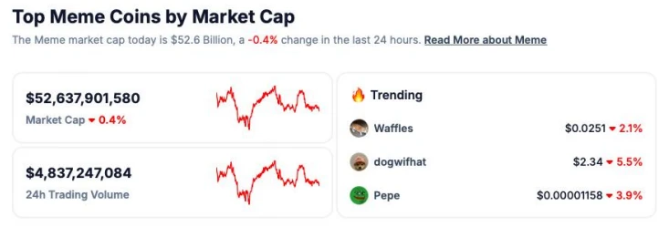 这轮牛市中启动的 Meme 项目颇有 ICO(Initial Coin Offering)时代的“公平”风气,绝 对的反 VC,号称所有人公平启动,所有筹码全流通,并且也造出了 PEPE、BOME 等几个财富神话。 Coingecko 数据显示,当前 Meme 板块总市值 526 亿美元,相较于年初增长超过 500% ,足以见得市场潜力。