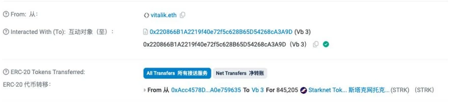 (V 神曾领取解锁的 STRK 并出售,获得 107 万美元)