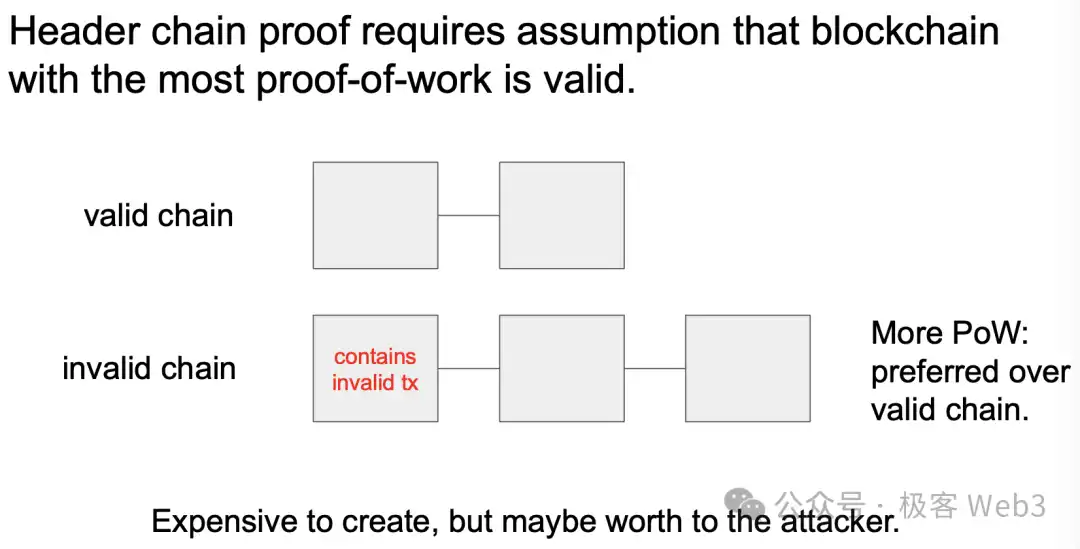 但由于不包含区块中交易内容的验证过程,header chain proof 只能假设拥有最多 POW 证明的区块链是有效的,并默认让比特币客户端同步这条链上的最新区块。这种场景下,虽然攻击者可以创建包含无效交易的区块,并在该区块之后添加更多区块,并生成 header chain proof 来蒙蔽同步历史数据的比特币客户端,但这样做的话攻击成本极其昂贵,并且会被现有的比特币全节点客户端直接揭穿。