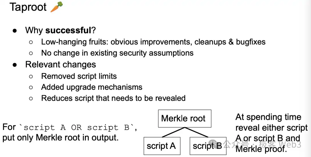 Taproot 升级改变了许多规则,从理论发布到真正被激活落地,花了三年半。Taproot 被启用的关键因素是:它没有改变现有安全假设,并对比特币协议做出了明显改进。例如,它允许使用 Schnorr 签名代替 ECDSA,二者都是基于离散对数假设,并使用相同的椭圆曲线,但前者比后者效率更高、计算量更少。