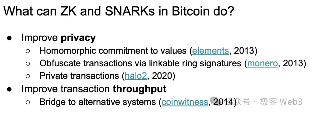 针对上述问题,比特币社区中有很多提案,理论效果最好的应该是和 ZK 及 SNARKs 相关的。借助 ZK 和 SNARKs,可以实现如下特性: