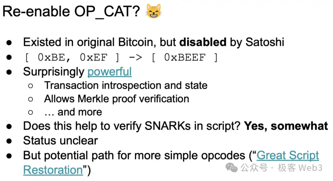例如,比特币脚本程序本来无法访问链上交易的金额等状态信息,但有了 OP_CAT 这将成为可能;OP_CAT 还可以用于验证 Merkle 证明。总之 OP_CAT 是属于底层操作码级别的升级,会衍生出非常多的新功能,很多人都提出过使用 OP_CAT 能达成的效果。