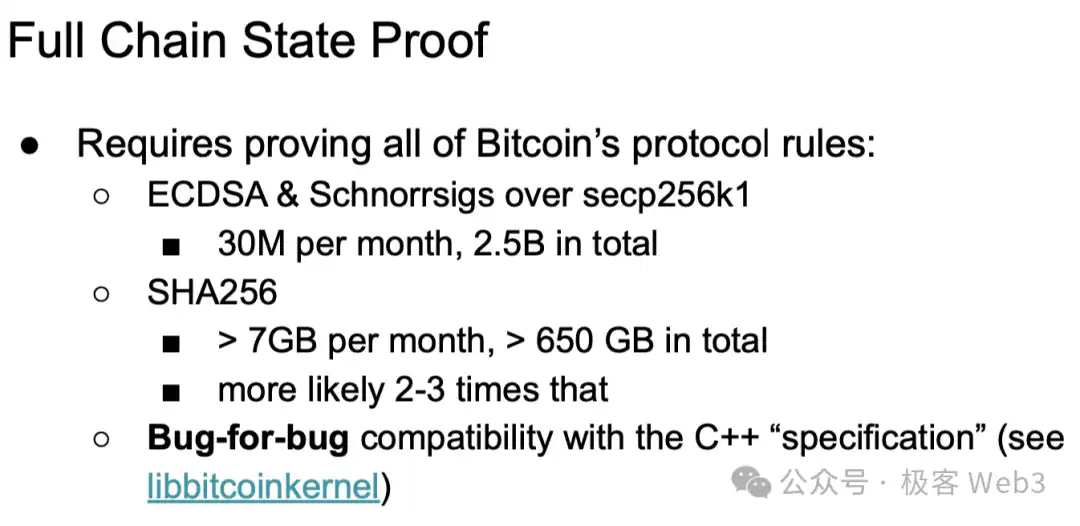 然而,尽管这种攻击场景的成功率很低,但如果可以让攻击者窃取巨大金额的 BTC,那么 header chain proof 就无法被认作是万无一失的方案。如果我们想证明完整的链状态,就需要直接证明比特币区块中所有的内容都有效,包括基于 secp256k1 椭圆曲线的 ECDSA 和 Schnorr 签名验证。