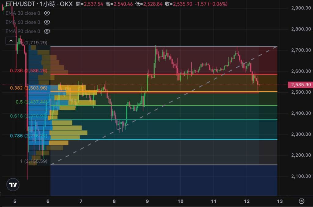 目前来看 2,500 美元是一个成交密集区,如果失守的话,接下来可能会去挑𢧐 2,400 美元的前低。