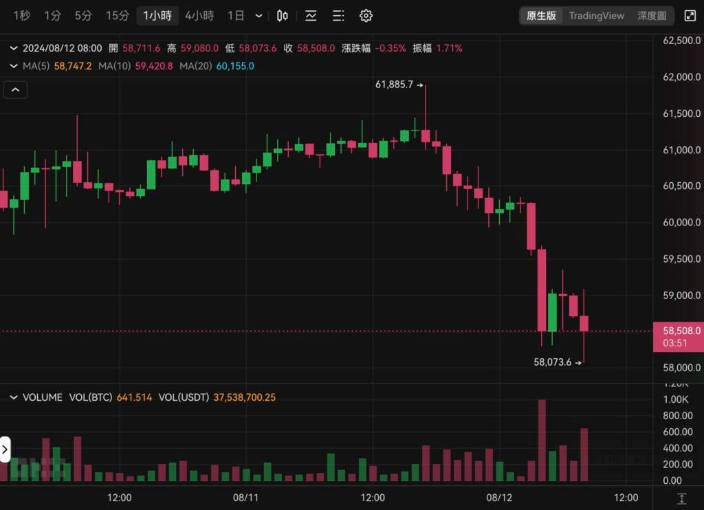 比 特币在昨(11)日傍晚一度上攻 61,885 美元之后,便𫔭啟震盪下行,今(12)晨八点半左右一度下杀 58,073 美元,其间下跌将近 6%。