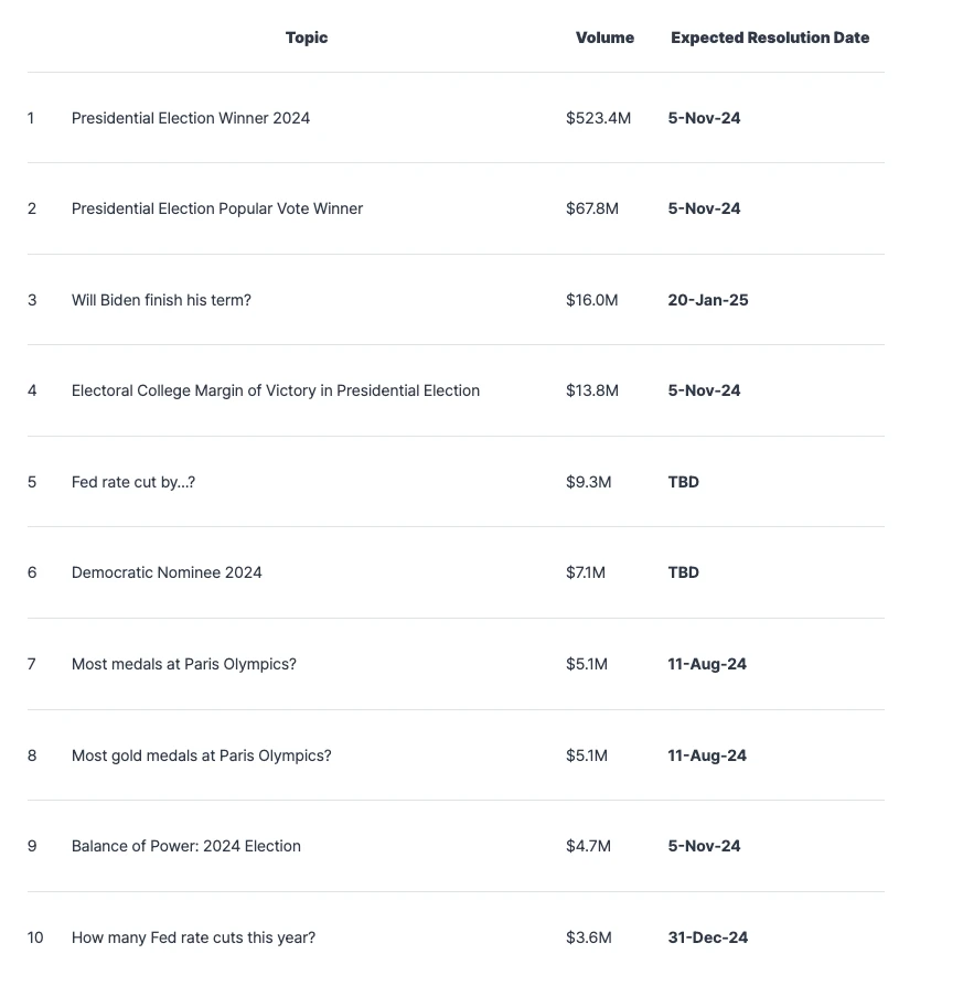 Polymarket 中交易量前十的预测主题结算日期如下,这与体育博彩形成鲜明对比,体育博彩的大多数结算时间都在几个小时或最多一周内结束。对于某些预测主题,人们不知道结算时间何时发生,甚至也不知道它是否会在主题结束日期之前发生。