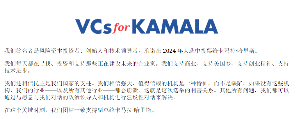 硅谷发起卡马拉支持活动,来源vcsforkamala官网