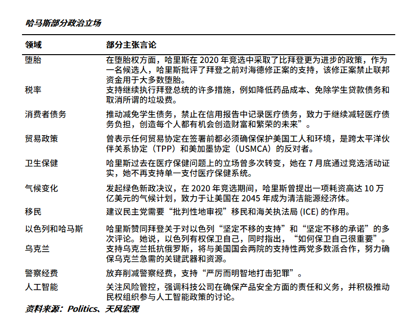 从政治主张来看,哈里斯和拜登一脉相承,在税收和外交上更多地继承和延续拜登的政策,比起单边主义的特朗普,强调反对孤立主义、倡导国际合作的外交政策,但在其他方面则创新与保守相对,突出个人差异性,例如在贸易政策,哈里斯反对自由贸易,同时也提出了更为激进的绿色经济议题。从优势而言,相比拜登,年龄问题不再成为总统候选人的困扰,她也更受女性和少数裔的青睐,日前其也开通了tiktok以贴近年轻选民,获得了400万粉丝。