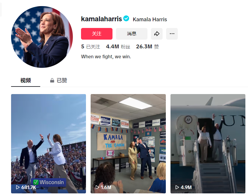哈里斯的tiktok账号备受关注,来源tiktok