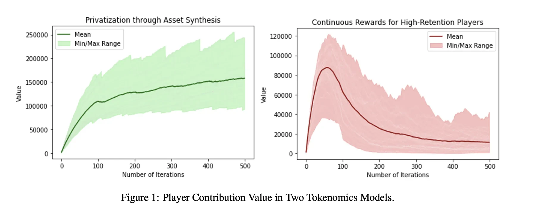 在资产合成私有化模型(左侧)中,我们观察到随着迭代次数的增加,玩家总贡献值呈现出持续的上升趋势,表明该模型能够有效地保持玩家参与并推动长期价值增长。相反,在持续奖励高留存玩家模型(右侧)中,玩家贡献最初呈现出显著上升,但随后显著下降。尽管该模型在早期阶段显示出较高的玩家贡献,但后续迭代中的下降表明在长期内维持玩家参与方面存在挑战。