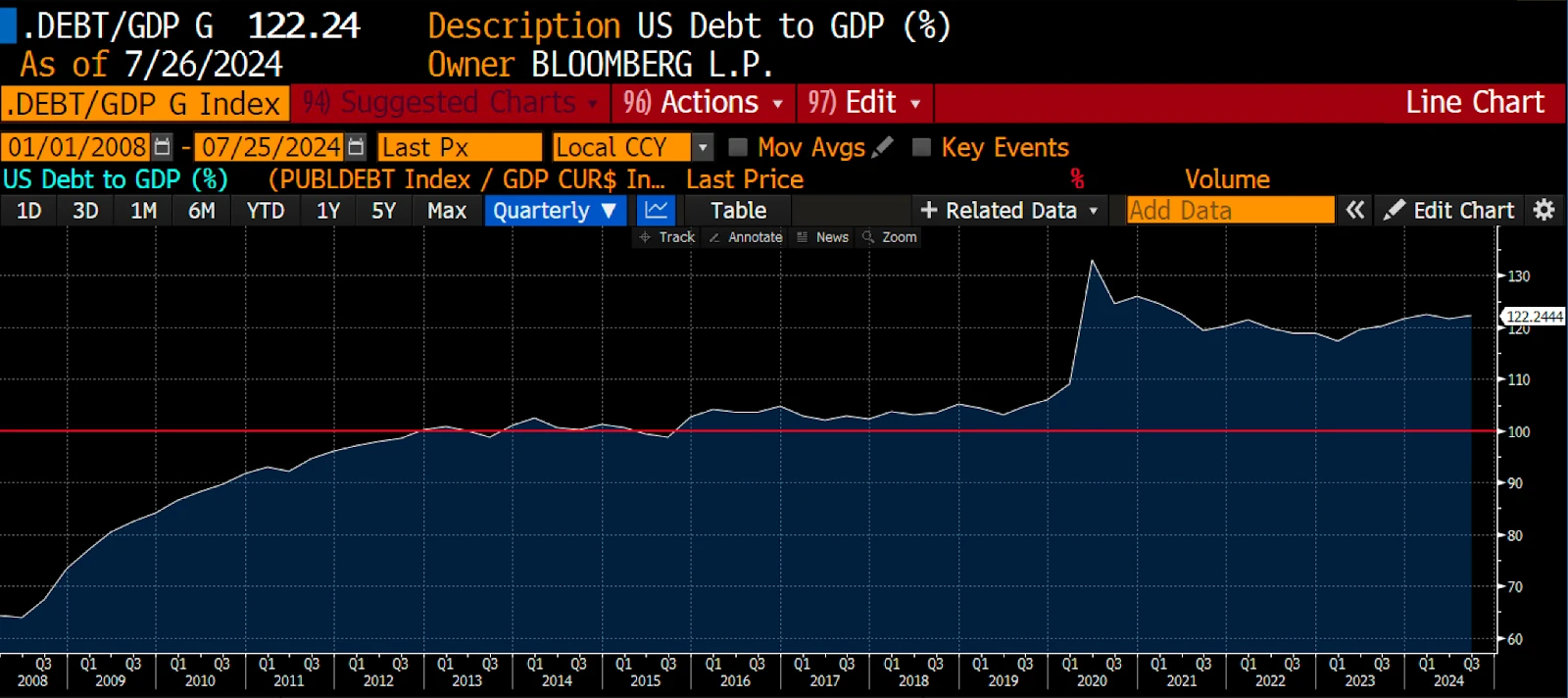 时间和复利决定了权力何时会从美联储转移至财政部。 当国债占 GDP 的比例超过 100% 时,在数学层面上债务增长的速度将明显超过经济增长的速度。当突破了这一临界点之后,控制债务供给的机构便将成为“做出决策的帝王” —— 因为财政部可决定债券的发行时间、规模及期限。此外,鉴于政府现在已深陷债务驱动增长的依赖,为了勉强维持现状,它最终也会指令央行动用印钞机来兑现财政部的支票。美联储的独立性已不复存在。
