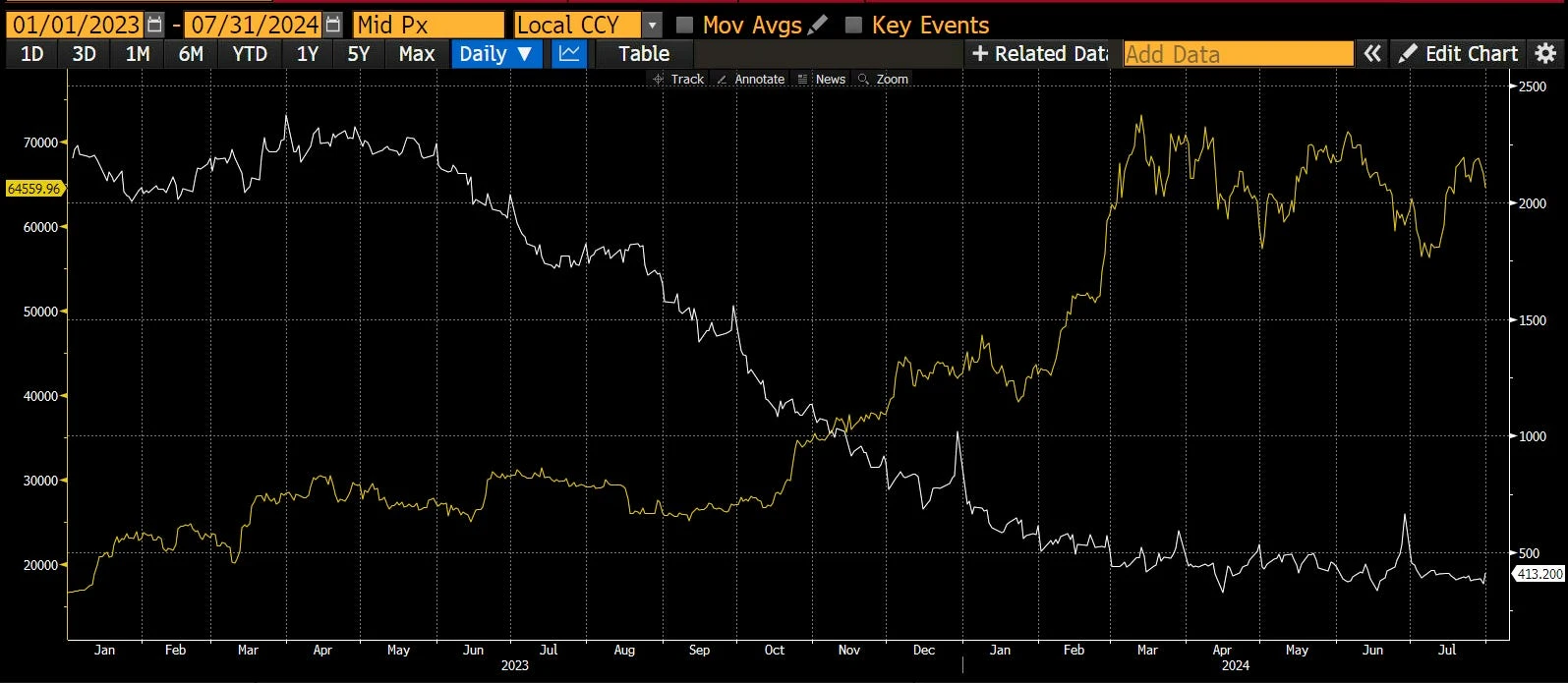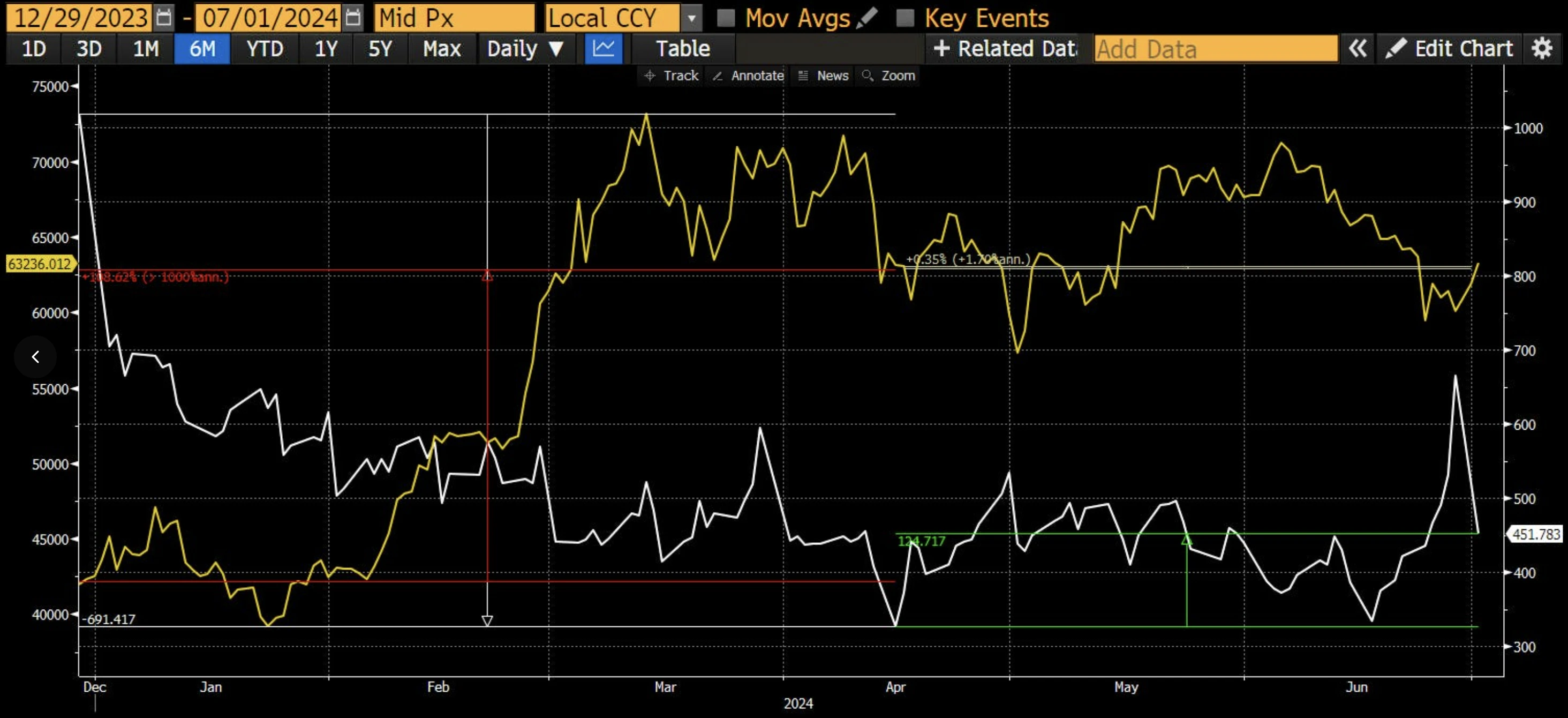 这张比特币(黄色)与逆回购(白色)的图表清楚地显示了: 在 1 月到 4 月期间,当国库券处于“净发行”状态时,逆回购规模下降,比特币价格将会上涨;4 月到 7 月,当国库券处于“净减少”状态之时,逆回购规模上升,比特币处于横盘状态,期间还伴随几次剧烈的下跌。