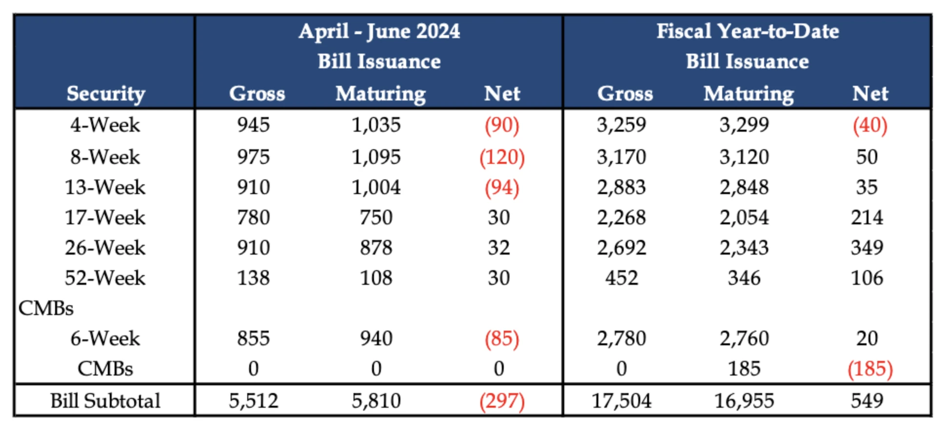 下一个问题在于,耶伦是否能将逆回购协议中剩余的 3000 亿到 4000 亿美元资金吸引到国库券之中?在最近的 2024 年第三季度季度性融资公告(QRA)中,财政部表示将在今年年底之前发行 2710 亿美元的国库券。这是个好消息,但逆回购协议中仍有一些剩余资金,耶伦还能做更多吗?